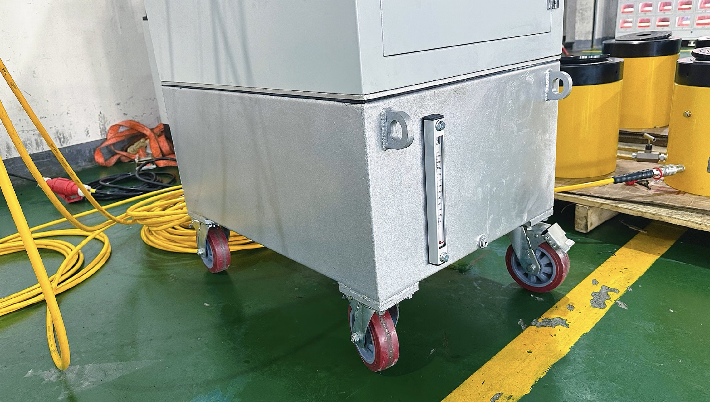 控制櫃底部帶(dài)四個小輪,便於(yú)移動,移動小輪帶(dài)自鎖功能,結構牢固,使用可靠。